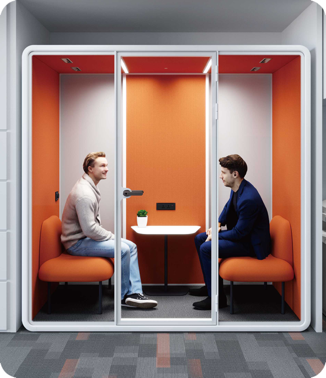 A VocoPod acoustic booth provides a private, sound-controlled workspace inside open offices. It is ideal for calls, online meetings, focused work, interviews, and noise-sensitive tasks that need a quiet environment.